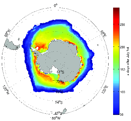 Store områder f.eks. Rosshavet har samme nuancer hvilket viser at både opfrysning og opbrud sker hvert år inden for ca. 14 dage